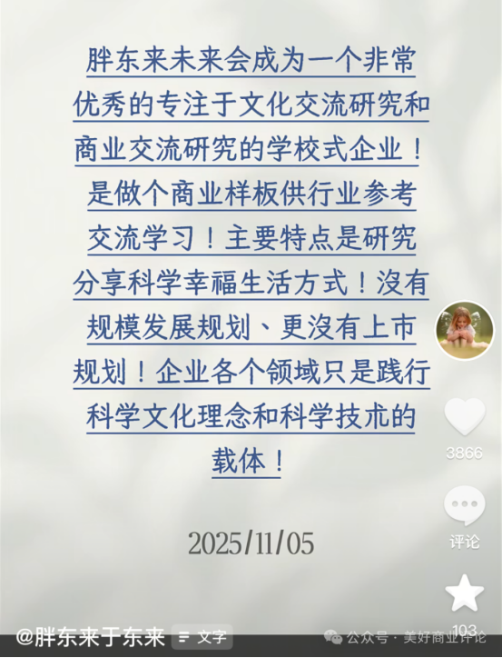 最近的一条抖音,大家去看一下,就是东来哥自己发的抖音,他说胖东来就是一个范式的学校一样,就是做了一个商业的实践学校,让大家用他这样的方式去做。所以他的心智并不是在扩大上面。